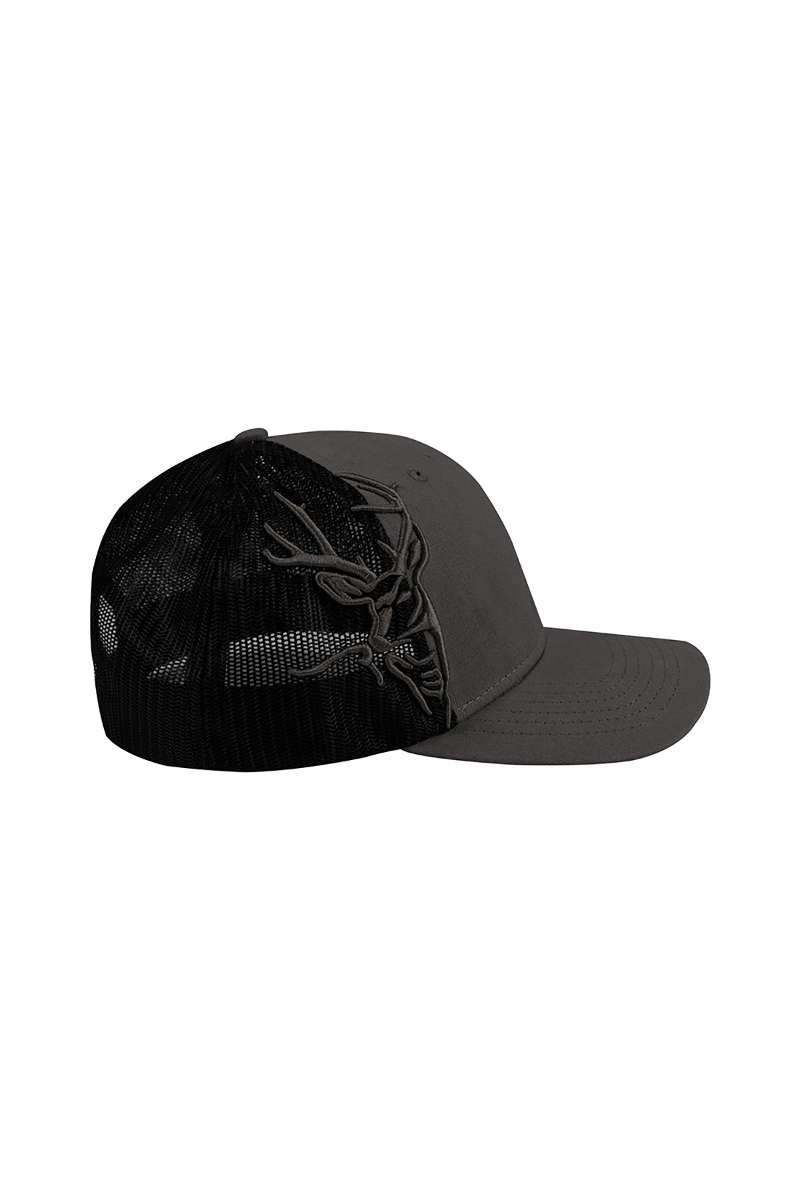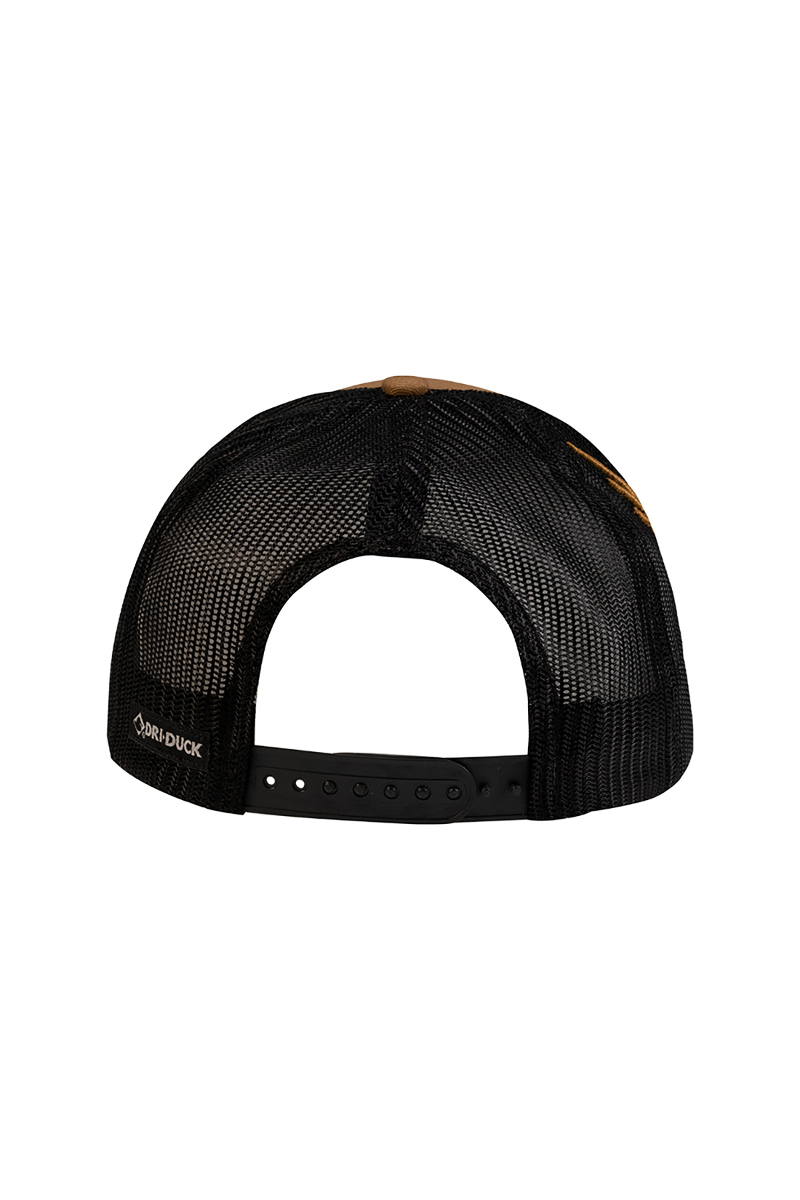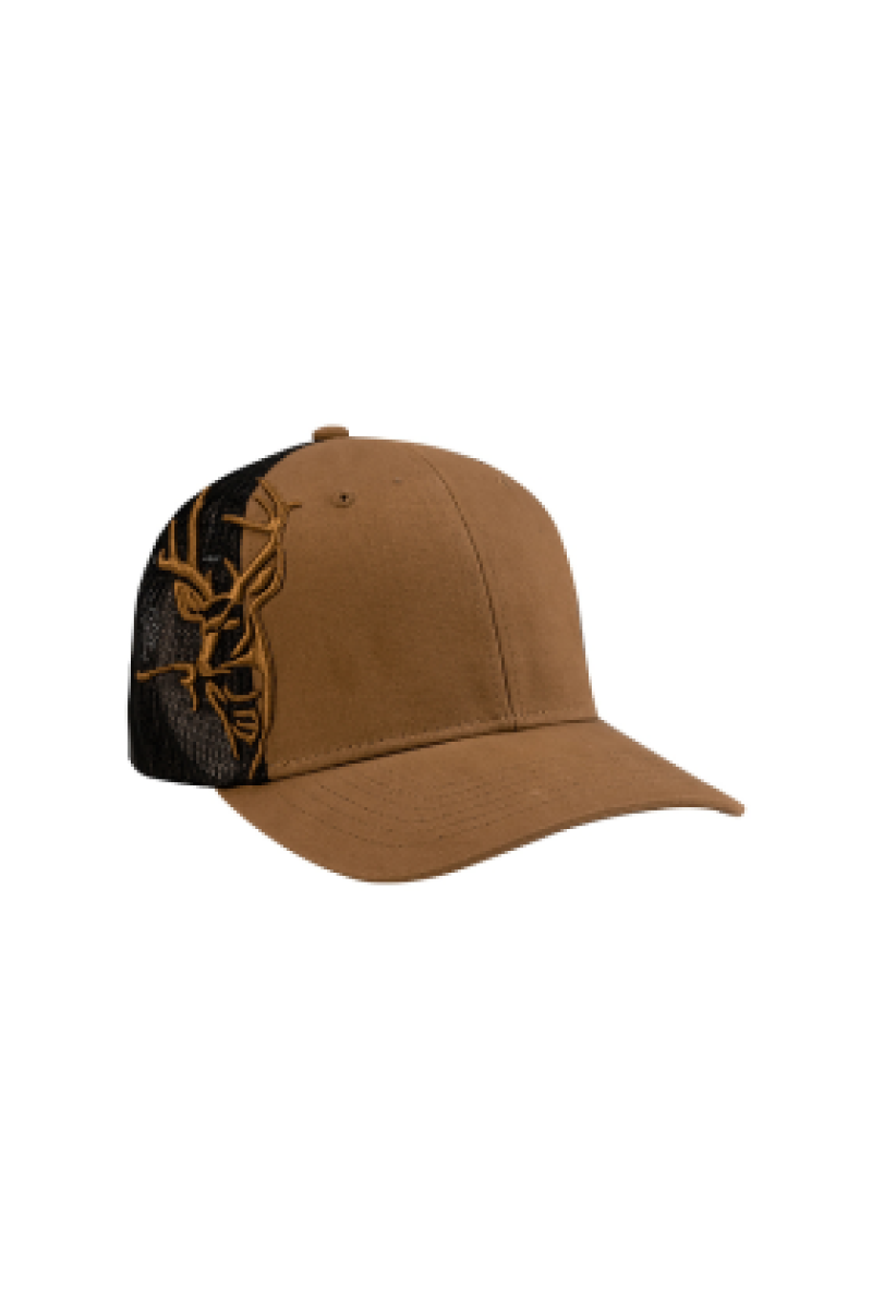 - Saddle and Charcoal: Front: 100% cotton brushed twill, Back: 100% polyester soft trucker mesh.