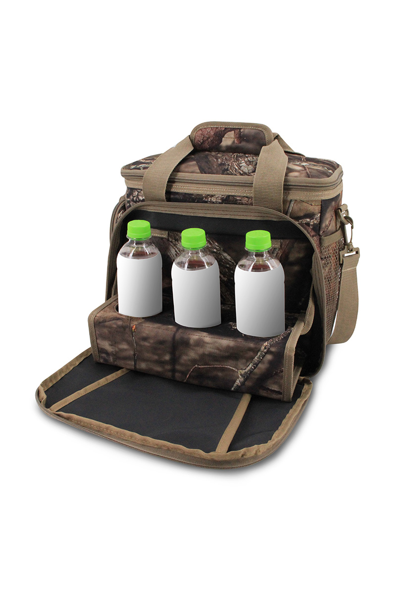 - Unzip the front pocket to reveal a pull-down tray that securely holds 3 drinks.