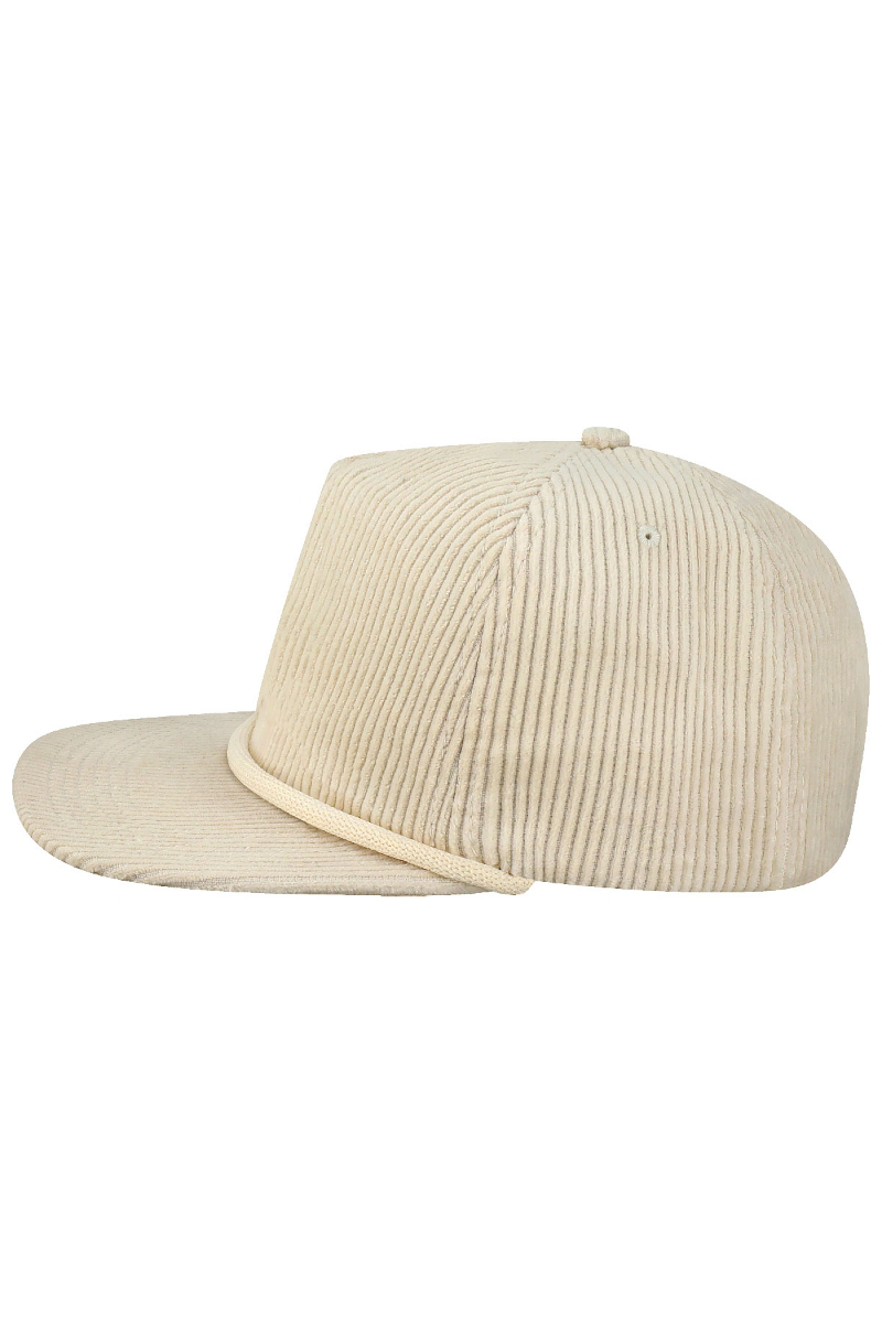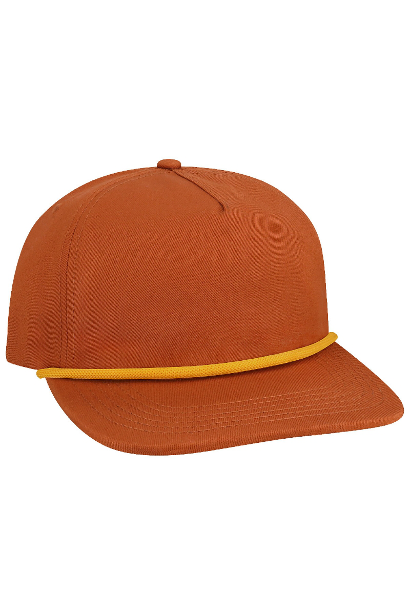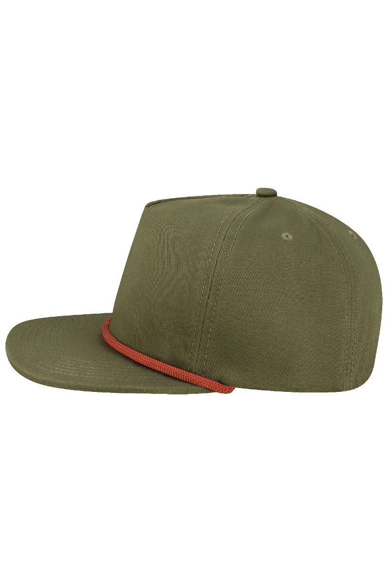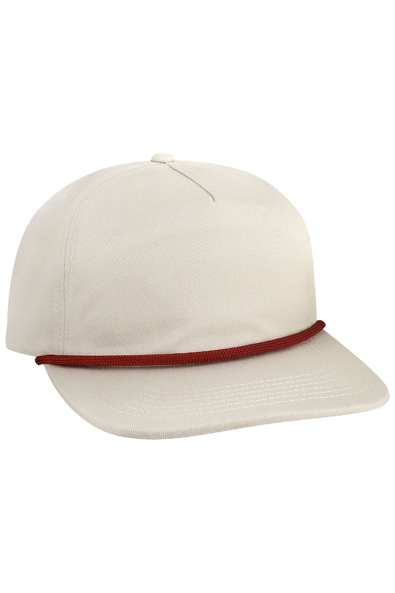 - Five-panel, low-profile with wide rope.